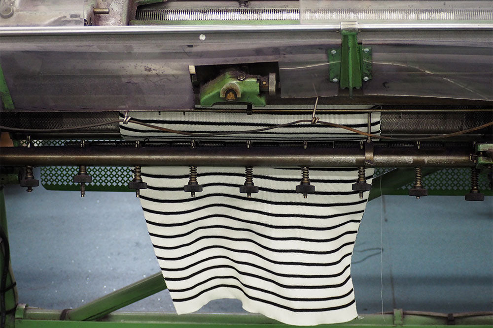 La laine est d’abord tricotée en panneaux sur nos métiers à tricoter, dont les réglages et la production sont supervisés par nos bonnetiers et maîtres tricoteurs. Une fois tricotés, les panneaux sont vaporisés pour stabilisation, sauf pour l’authentique pull Matelot, dont la matière est stabilisée par une mise à plat sur claies pendant 72 heures, garantissant ainsi sa forme et sa qualité inégalées.
