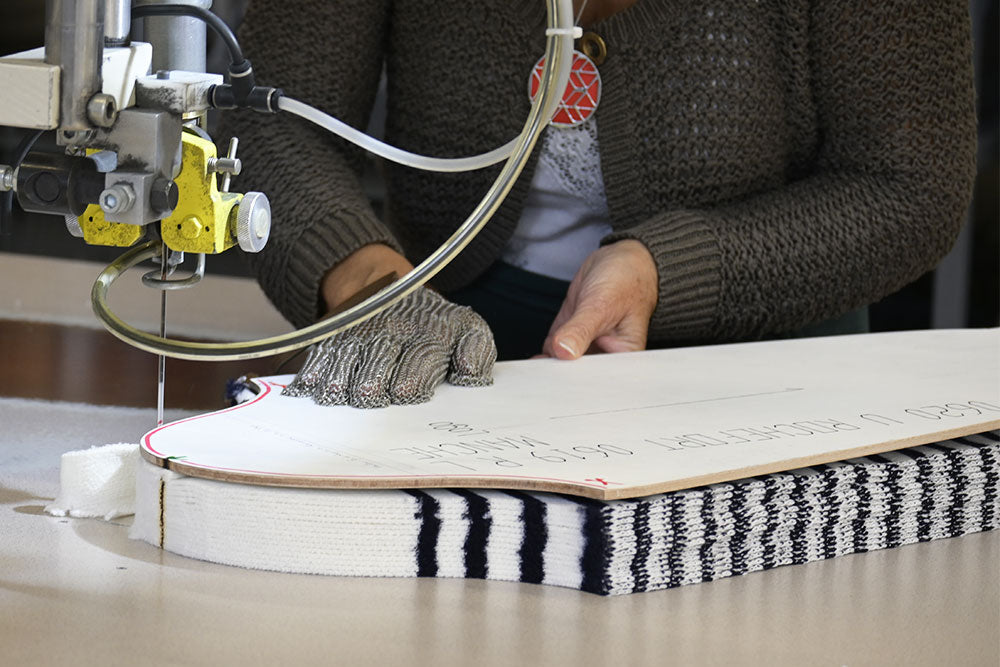 Après le tricotage, vient la découpe des panneaux selon les patrons, puis l’assemblage minutieux. Nos couturières réalisent le piquage, le surjet et le remaillage des bandes boutonnées et du col, et posent étiquettes, écusson et logo SAINT JAMES.