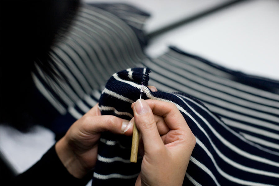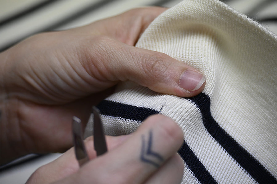 Notre Atelier vous propose de réparer votre pull SAINT JAMES. Cette réparation concerne nos pulls iconiques, en laine, à col rond et avec des boutons sur l’épaule.