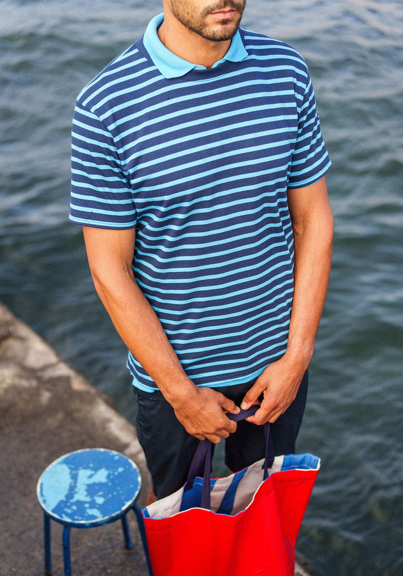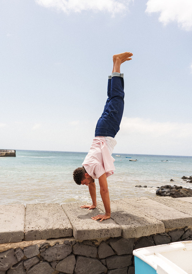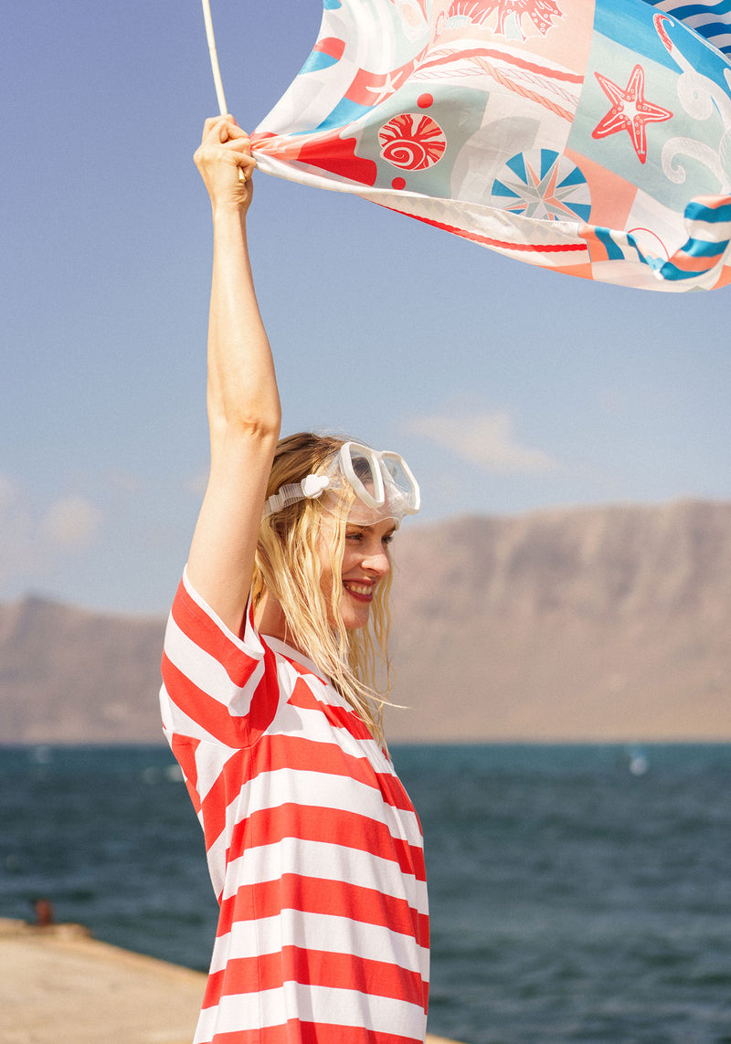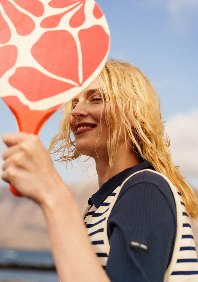 Les silhouettes, à la fois compactes et dynamiques, adoptent des volumes boxy et des manches larges qui accompagnent le corps sans le contraindre. Les matières, légères et aériennes, traduisent une envie de saison, de mouvement et de confort. Les micro-rayures insufflent un rythme graphique subtil, évoquant les codes du jeu, entre structure et spontanéité.