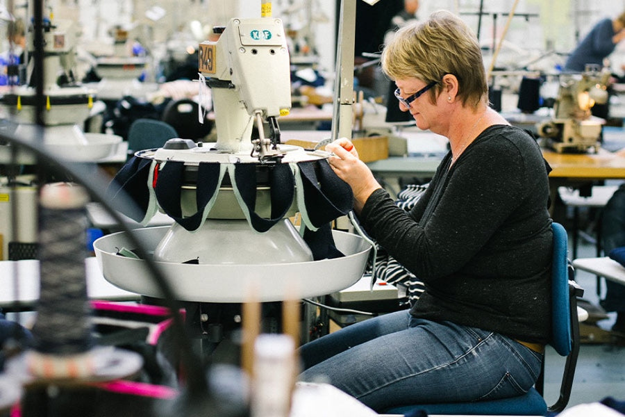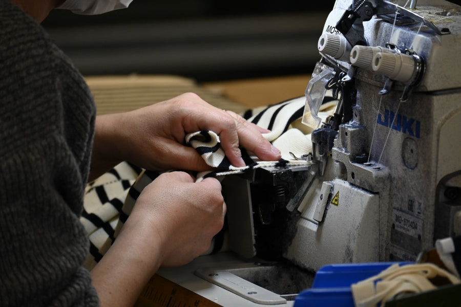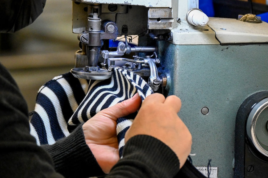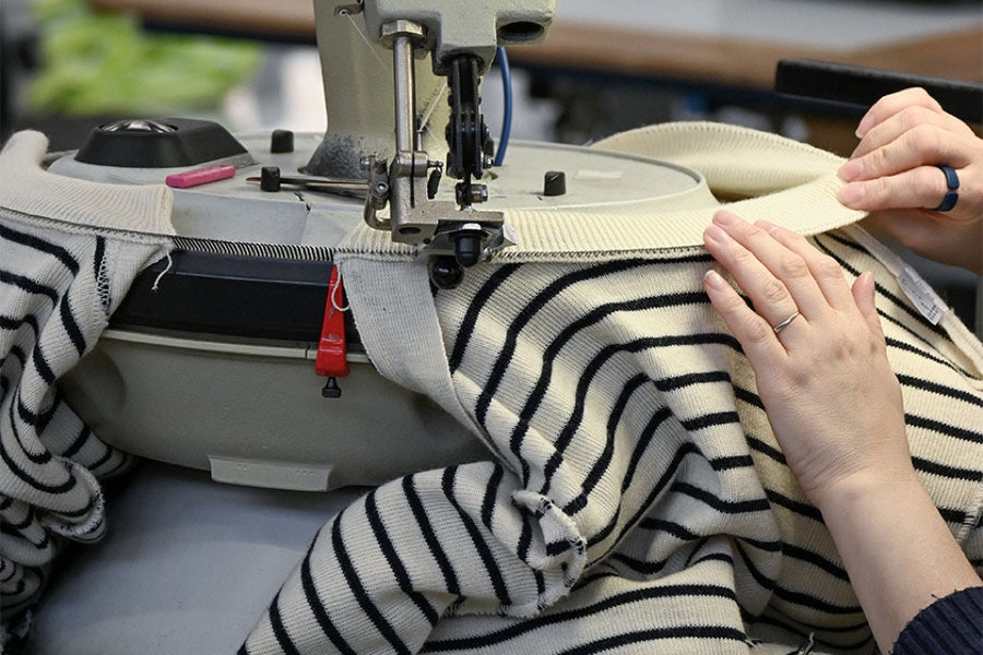Entre le début et la fin du processus de confection, chaque vêtement SAINT-JAMES bénéficie du savoir-faire de 18 paires de mains. Il est tricoté, coupé, assemblé,raccoutré et repasser par des artisans au geste sûr et à l'oeil expérimenté.
